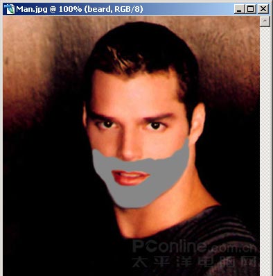 2、新建一个图层,并命名为“beard”或者“胡须”。养成给图层命名的好习惯,在图层复杂时有利于我们快速找到希望操作的图层。使用画笔工具在图层涂沫(颜色使用灰色即可,例如#888888),不用精确的绘制,大致得到下图这样的形状就可以了。这里涂沫的区域待会都会“长出”胡子来。