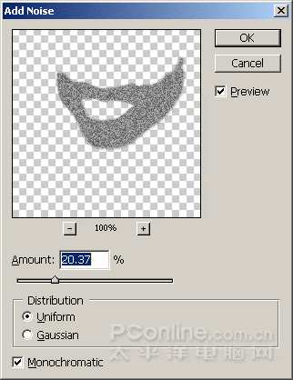 3、执行菜单“滤镜>噪点>添加噪点”命令,如下图所示。数量根据需要而定,数值越大,“长”出来的胡子就越黑。