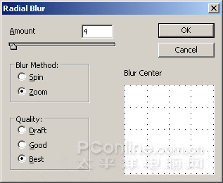 接着执行菜单“滤镜>模糊>径向模糊”。模糊方法为缩放,质量选择最好,数量视需要而定。数量值越大,胡子就“长”得越长,足够长时就长成毛了,呵呵。
