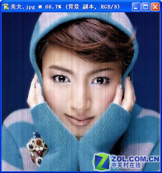 在photoshop中打开照片,首先复制图层,在复制背景图层中进行操作。单击“滤镜”—“纹理”—“颗粒”命令,设置“强度”为12,“对比度”为13,“颗粒类型”为垂直,单击“好”按钮,得到(如图1)所示的效果。