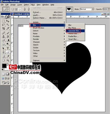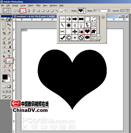12.新建一个文件,选择工具箱中的图形工具,并选择心状图形。(注意路径三个选项中用最后一个,既直接产生像素)(图12)