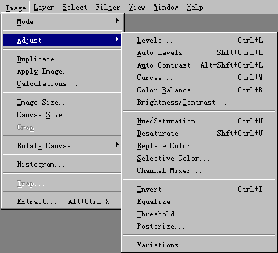 在Photoshop中打开一幅图片,选择Image>Adjust,就进入了Photoshop的调色天地:这其中包括:Levels(色阶)、Auto Levels(自动色阶)、Auto contrast(自动对比度)、Curves(曲线调节)、Color Balance(色彩调节)、Brightness/Contrast(亮度/对比度)、Hue/Saturation(色相/色彩饱和度)、Desaturation(去除彩色)、Replace Color(替换颜色)、Selective Color(选定颜色)、Channel Mixer(通道混合者)、Invert(反转)、Equalize(相等)、Threshold(阈值)、Posterize(色调分离)、Variations(变更)等指令。