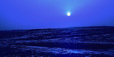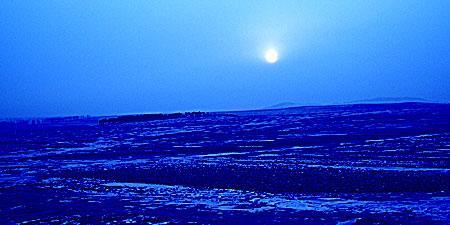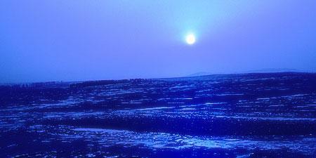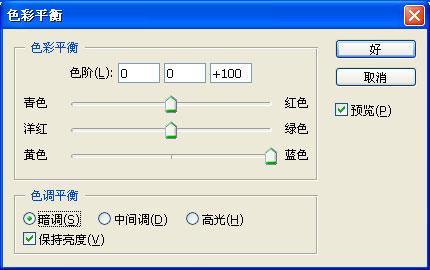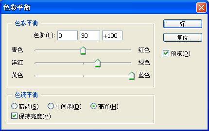 第二步:使用“图像/调整/色彩平衡”进行颜色的调整。数值分别设置如下:保持亮度、高光为0、30、100,中调为100、0、0,暗调为0、0、100。点击“确定”得到如下结果: