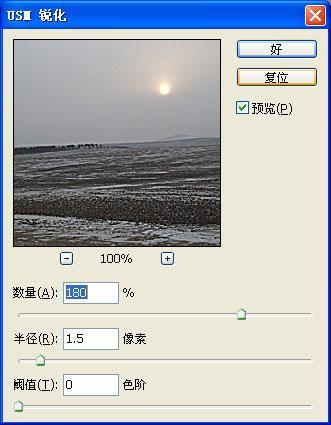 第一步:因为画面比较模糊,所以先使用“滤镜/锐化/USM锐化”进行锐化操作。[输入数值为:数量180,半径:1.5,阈值:0]。