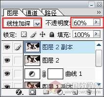 5.对图层2副本执行“滤镜/模糊/高斯模糊”,并把混合模式设为“线性加深”,不透明度设为60%。