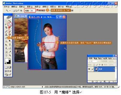 (3)用“魔棒”选择。使用【魔棒工具】并设置好容差在“自己”图片中进行选择,如图 87-5 所示