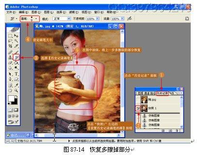 (12)修整陶礶边缘。由于擦除时多多少少会将不需要擦掉的图片擦掉,因此可以使用【历史画笔工具】恢复,如图 87-14 所示。