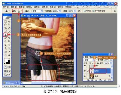 (13)延长腿部。因为“自己”照片只照了一点腿部,所以显得只有一截腿,使用【仿制图章工具】复制腿部使其,如图 87-15 所示。