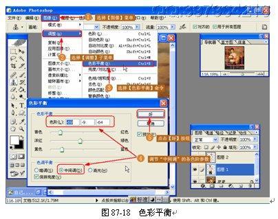 (16)色彩平衡。再使用【色彩平衡】命令更改图片的色彩,使得图片与原画色彩非常接近,如图 87-18 所示。