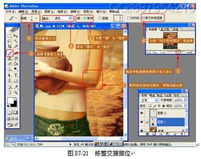(19)修整交接部位。利用【修复画笔工具】修改手臂交接处,使其过渡更加自然,如图 87-21 所示。