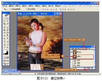 (9)建立快照。为现在状态建立一个快照,这可以为下面使用【历史画笔工具】提供条件,如图 87-11 所示。