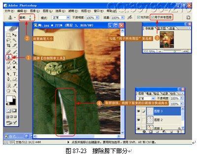 (21)擦除胯下部分。上面延长腿部时,原画的白裙还留下了一些,同样运用【仿制图章工具】将其换成背景的大海,如图 87-23 所示。