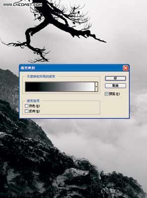 步骤二:执行图像 — 调整 — 渐变映射,调出渐变映射设定对话框。可以选勾仿色(Dither)选项以增加渐变的平滑。实验下来,效果不是很明显。其它选项保持默认值不变,完成之后渐变将会自动依照图像的灰阶数值,自动套用到图像上。即转为黑白照片形式。