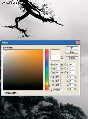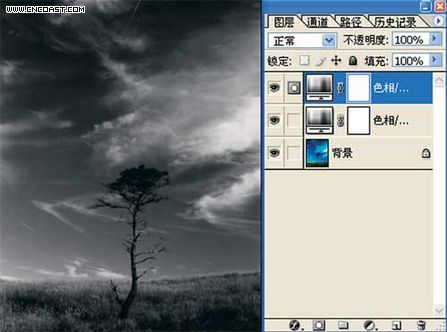 选择菜单“图层—新调整图层—色相/饱和度”,模式设为“颜色”,确定。在“色相/饱和度”对话框中,设定饱和度为-100。将图像由彩色转化为黑白。如图8