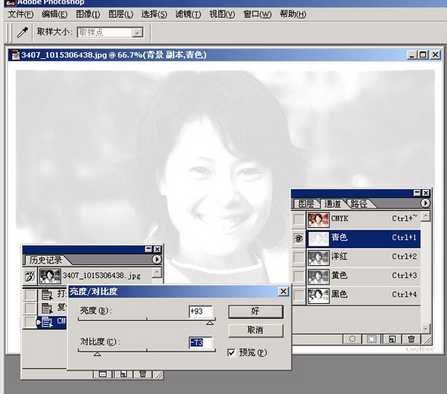 2、选青色通道(C通道),将对比度调小,亮度调大。人的皮肤色即可出来。不满意的话可采用其它手段再调调。