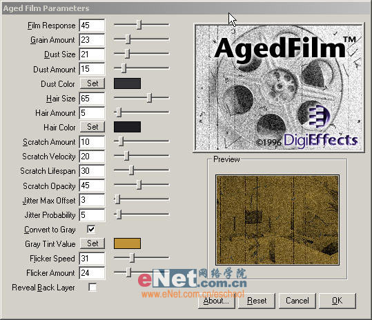 2.打开一个素材文件,选择滤镜/DiGiEffects/AgedFilm,命令,得到Aged Film