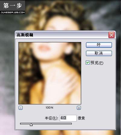在原图上复制一个新图层,再对此图层进行大幅度的高斯模糊(GAUSSIAN BLUR),数值为4.0