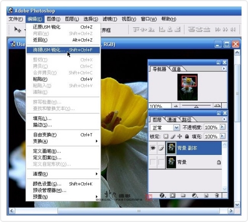 第四步.USM后,【编辑】菜单里出现一项【消退xxx】命令或用快捷键“Shift Ctrl F”(偷偷告诉你,使用滤镜后,最后用的就会出现消退后面,这可有别的用处),开!