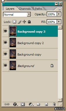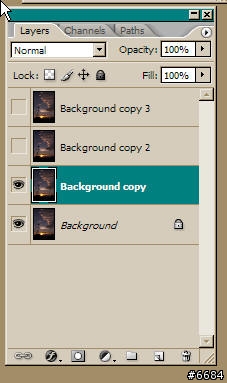为了方便起见,我们从下面的图层开始。先把上面的图层关掉(就是把前面的眼睛图标点掉,隐藏起来),然后选定Background copy这个图层。