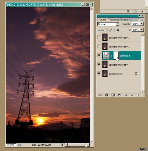 接下来又要用到简单的掩码观念了。为了要让视线能集中在中间的夕阳,我们要让周围呈现出一种类似『边缘失光』的效果(奇怪,那买名镜干嘛?不是一对人对镜头周边失光很感冒的吗?),因此我们要利用掩码来达成。首先先选定旁边的掩码(手指形光标所指之处)