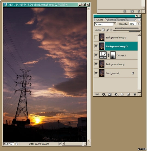 再来我们要继续往上面的图层作业了。我们选择Background copy 2,然后将它的属性设为『screen』