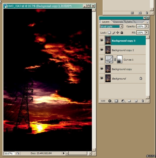 这样口味还不够重,是吗?我们再选定最上面的图层,把图层属性调整为『Vivid Light』