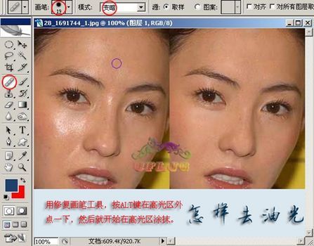 用修复画笔工具,按alt键在高光区外点一下,然后就开始在高光区涂抹。