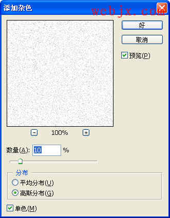 打开原图,然后创建一个新的图层,填充为白色。之后执行杂色滤镜,设置如下图: