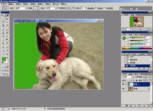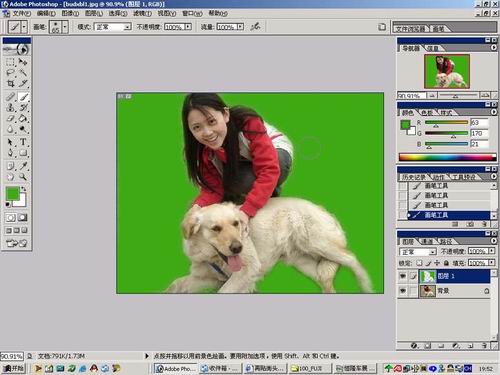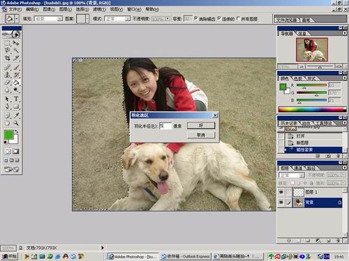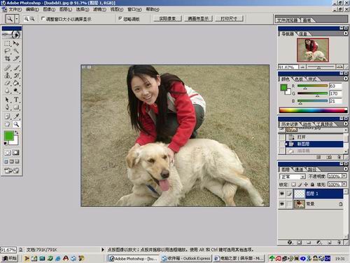 接下来大家先修正一下细节,然后只要稍微锐化一下,草地的效果就更好了,最后根据个人喜好,调整一下颜色,一张不错的PP就做好了。另外,草地的颜色可以通过调整新建层的。头发边缘的细节修正,很简单的就是用画笔工具,选择带边缘柔化的,稍微补一下就好了,补色不同于扣图,比较方便的,万一颜色涂到人和狗身上,也可以用带柔化的橡皮擦掉:)