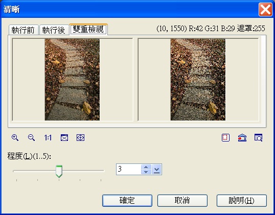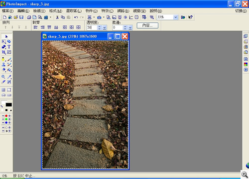 Photoimpact 8之中,一个我们常遇到的问题是,我们想要的清晰度调整,并不落在整数的数值上,例如,参数=2 觉得太清晰,参数=1 又觉得还不够,此时,可以在基底影像上加一个图层,设定其透明度解决此问题。