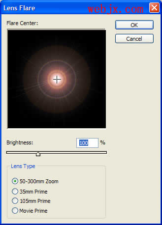 新建立黑背景文件,新建立一图层,执行镜头光晕滤镜: