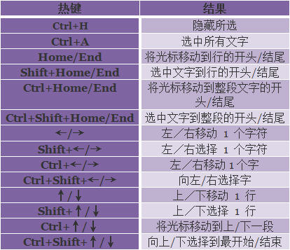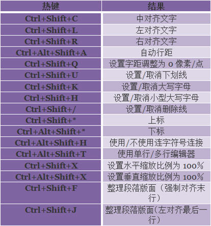 25、下面的表格所提供的热键能够让你控制文字/段落的特征:
