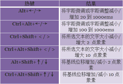 24、下面表格中的热键能够让你控制文字的相对位置: