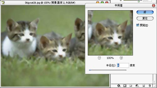然后选择虑镜、杂色、中间值,对上面一个图层做虑镜处理,大家应该知道它的效果了,处理如下: