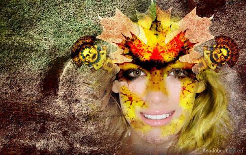 5:为了让脸部的皮肤看起来不那么光滑,我给图像添加了一张树皮的纹理,运用蒙板和叠加制作出皮肤龟裂的效果。(如图6)