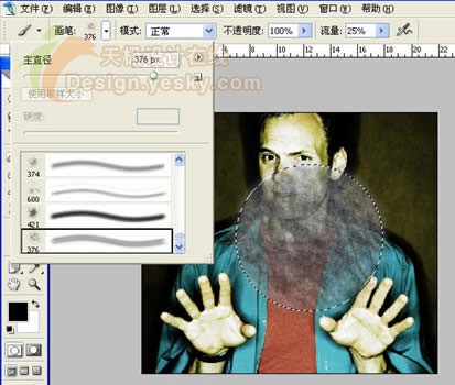 下载的NS1画笔存储到Photoshop安装文件下的“预置\画笔”中,就可以从画笔菜单中找到它使用了,选择这个笔刷工具组合里任意笔刷填充圆形,选择填充色为黑色,填充的混合模式为正常模式(默认是“线性加深”模式),填充圆形图案(图14)。