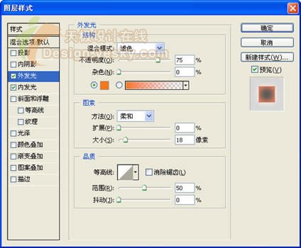 接下来设置圆形图层的混合模式,其中在“外发光”效果中设置它的阴影颜色为金黄色,大小为“18”像素。然后在内发光模式中设置阴影颜色为金黄色,大小为“16”像素(图16)