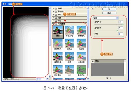 (7)设置【壁画】参数。在弹出的滤镜对话框中设置好【壁画】滤镜的参数。