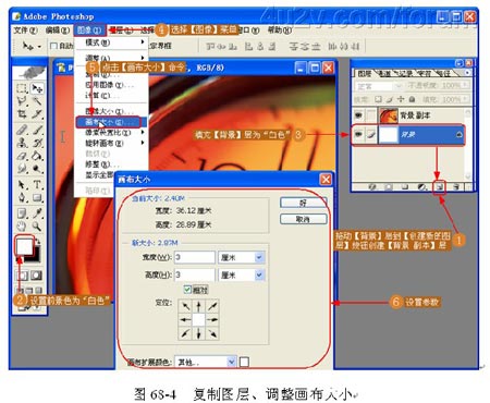 (2)复制图层、调整画布大小。把【背景】层拖到【创建新的图层】按钮,创建【背景 副本】层,接着把【背景】层填充为白色,然后调整【画布大小】,如图 68-4 所示。