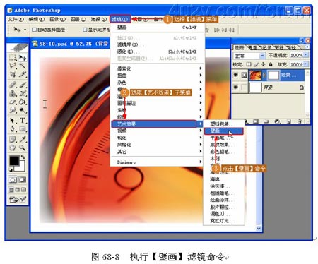 (6)执行【壁画】滤镜命令。对上面的操作步骤满意后,按 Ctrl D 取消选区。进而执行【滤镜】|【艺术效果】|【壁画】命令,如图 68-8 所示。