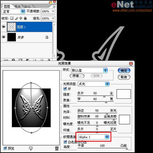 7.好了,有关通道的操作就进行到这里了,接下来回到图层面板,继续对图层1进行操作。执行滤镜/渲染/光照效果,将其中的纹理通道选项选择为Alpha 1,这一点很重要,**的参数设置可以从图中看到。如图7所示。