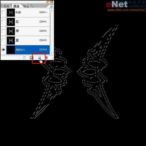 4.填充颜色后并不要急着将选区取消掉,留着还有用,单击“通道”选项卡,进入到通道面板,按下新建通道按钮,新建一个Alpha 1通道。如图4所示。