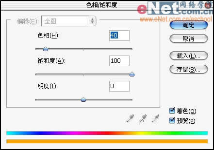 9.按下Ctrl U执行色相/饱和度命令,选中“着色”选项,并通过调节滑块给饰品上色。这里我设置的40、100、0是金黄色。如图9所示。