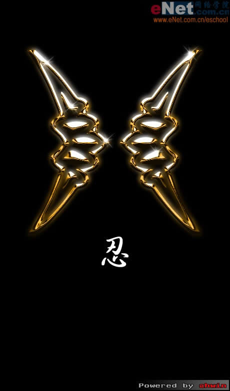 12.最后进行一些细节加工,这里我通过特殊画笔给饰品高光处加上了闪烁的效果,特殊画笔可以从网上下载到。在饰品的下方打入我们这款黄金饰品的主题——“忍”,为什么要叫“忍”呢?因为这个图形就好像一双手攥紧了拳头握着两把凶器,怒发冲冠,却又能沉得住气,哈哈,人生路上要想成功,很多时候还是要忍着点,所谓“小不忍则乱大谋”。OK,大功告成了,拍拍手。如图12所示。