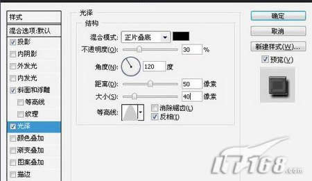 添加光泽特效,不透明度30%,距离50像素,大小40像素。如图11所示。
