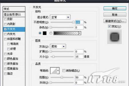 接着给金属面板下方的两个部件进行图层样式的添加,首先是添加外发光特效,混合模式为正常,选区黑色,不透明度100%,大小为15像素。如图12所示。