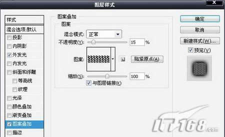 添加图案叠加样式,这样做是为了与前面的面板区别开,更加突出前面的面板。选择好叠加的图案,将不透明度设置为15%。如图13所示。