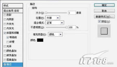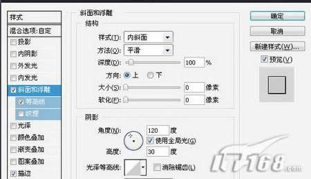 这样金属面板整体制作就完成了。接下来就需要给按钮上面添加文字。选择文字工具,在金属面板上打入“金属风暴”四个字设置为超粗黑,并将填充设置为30%。接着进行斜面和浮雕样式的添加,使用内侧面样式,大小和软化皆为0像素,**数值保持默认。如图17所示。