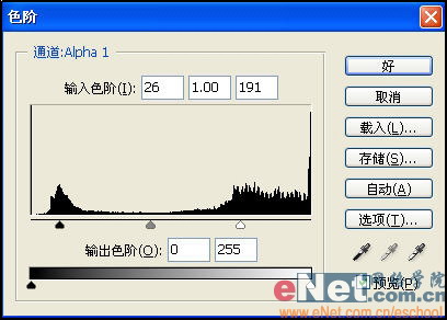 4、按Ctrl D键取消选区,按Ctrl L键弹出色阶对话框,设置如图03所示,然后按Ctrl I键执行“反相”操作,得到的画面效果如图04所示。