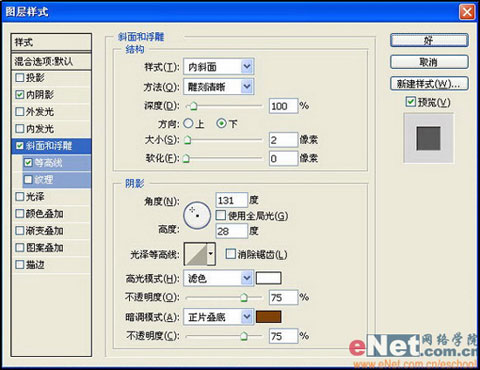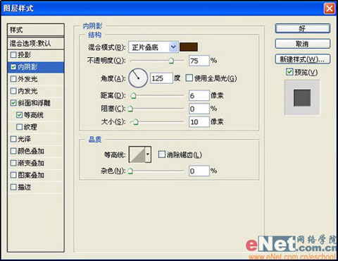6、选择图层2,单击“添加图层样式”按钮,在弹出的下拉列表中选择“斜面和浮雕”命令,设置弹出的对话框如图05所示。在对话框中选择“内阴影”选项,设置其对话框如图06所示,得到的画面效果如图07所示。